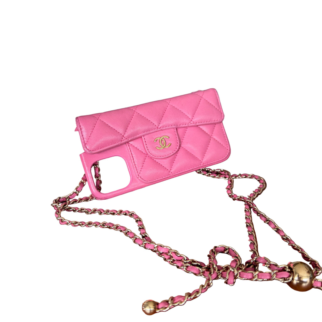 Chanel Pearl Crush Phone 12 Case with Chain – Lambskin Pink