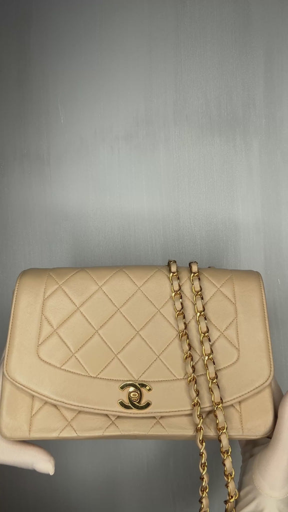 This vintage Small Diana flap bag is crafted from supple beige lambskin leather with gold-plated hardware. It features the classic front flap with CC turn-lock closure and an interwoven gold-plated chain and beige leather strap, allowing it to be worn on the shoulder or crossbody.