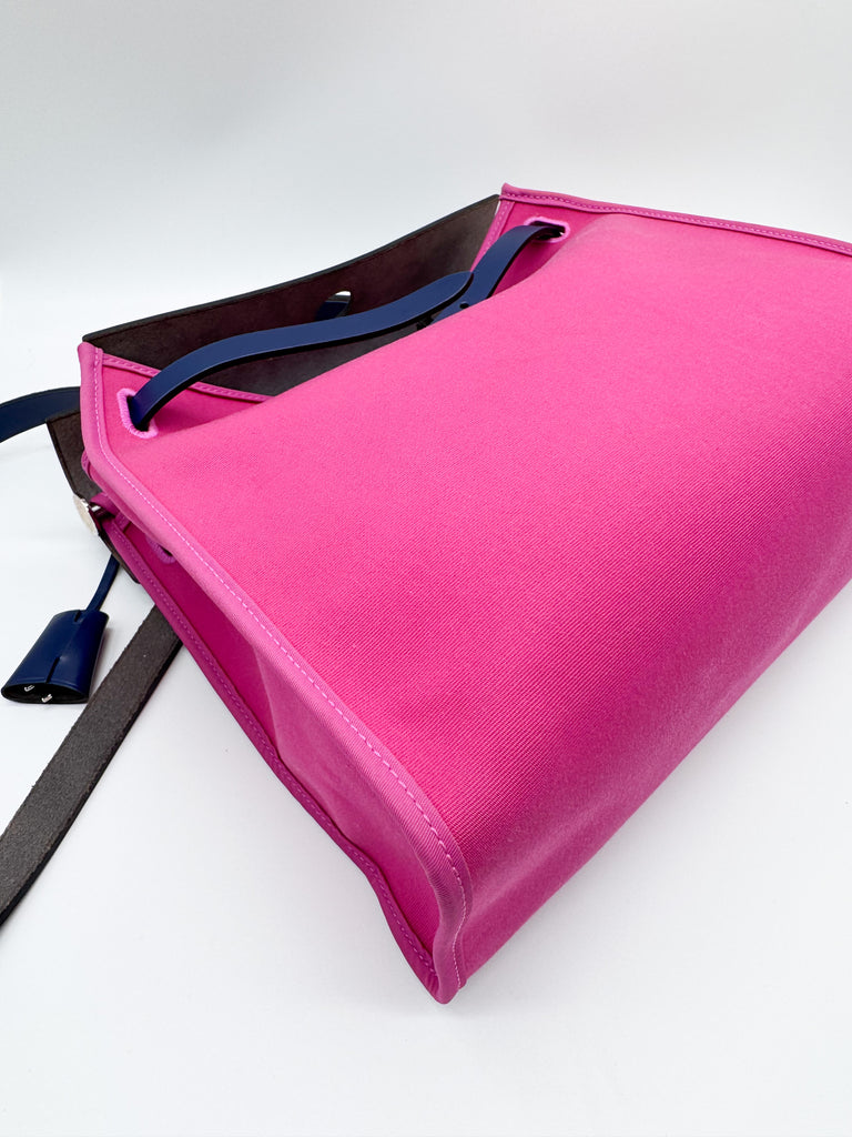 The Toile Herbag Zip 31 combines a canvas body with leather trim, flat leather top handle flat leather shoulder strap, a front flap with pull-through strap closure exterior back zip pocket, a detachable interior zip pouch, navy blue