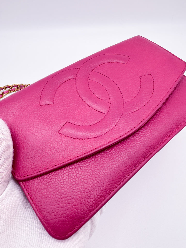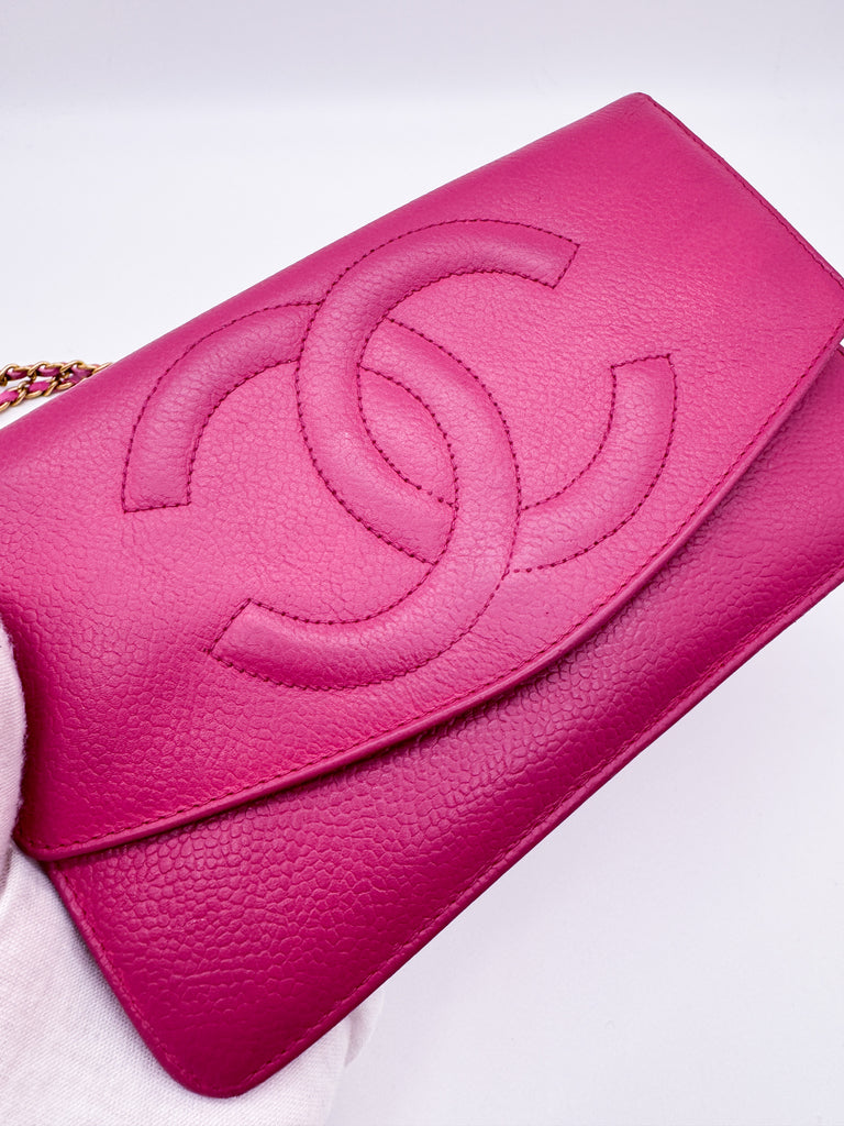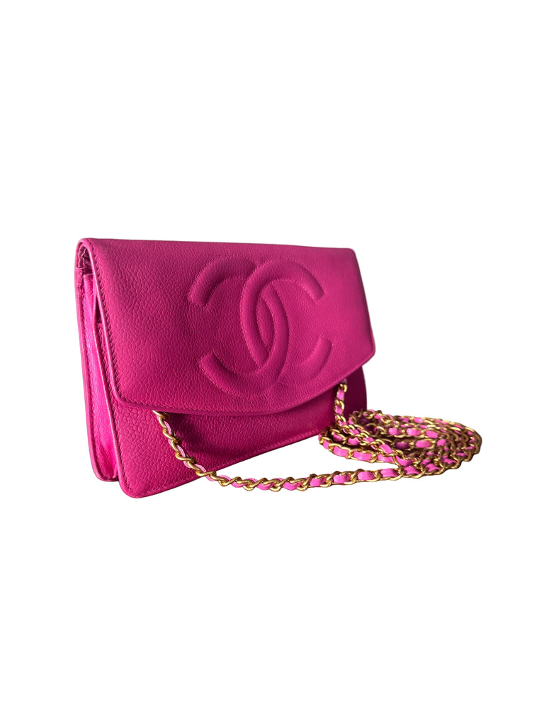 This authentic vintage Chanel Wallet on Chain (WOC) is crafted from luxurious pink caviar leather and features a versatile design. The wallet can be worn over the shoulder, crossbody, or folded down to function as a clutch. It has enough space for essentials such as a phone, keys, and a card holder. Please note: it comes with a non-branded chain.